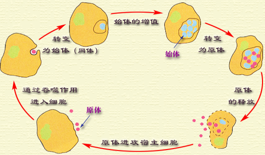 - 始体:始体呈大形球状(直径达1~1.5μm),细胞壁薄而脆弱,易变形,无传染性,生长较快,通过二分裂可在细胞内繁殖成一个微菌落即“包涵体”,随后,每个始体细胞又重新转化成原体,待释放出细胞后,重新通过气流传播并嗣机感染新的宿主。整个生活史约需48h。