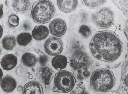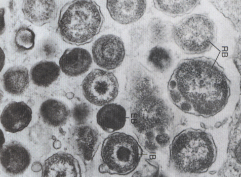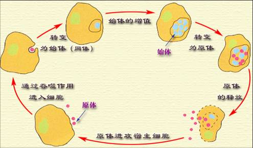 - 原体:具有感染力的细胞称为原体。呈小球状(直径小于0.4μm),细胞厚壁,致密,不能运动,不生长,抗干旱,有传染性。原体经空气传播,一旦遇合适的新宿主,就可通过吞噬作用进入细胞,在其中生长,转化成无感染力的细胞,称为始体或网状体。