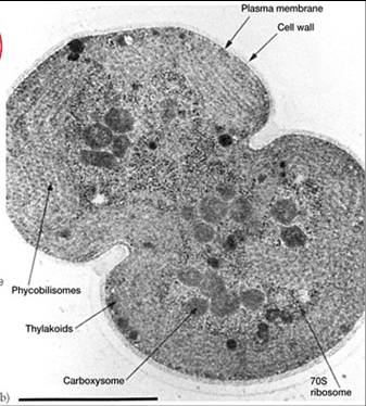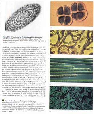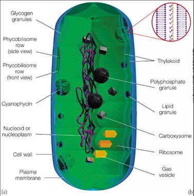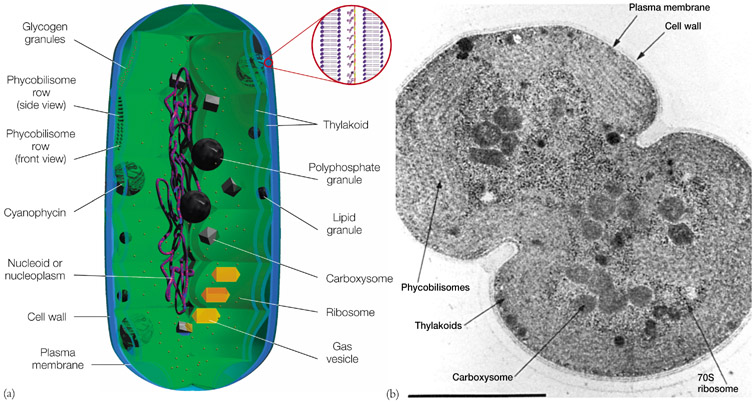 - 蓝细菌的细胞质周围有复杂的光合色素层,通常以类囊体的形式出现,其中含叶绿素a和藻胆素。细胞内还有能固定CO2的羧酶体。在水生性种类的细胞中,常有气泡构造。细胞中的内含物有可作碳源的糖原、PHB,可用作氮源的蓝细菌肽和贮存磷的聚磷酸盐等。