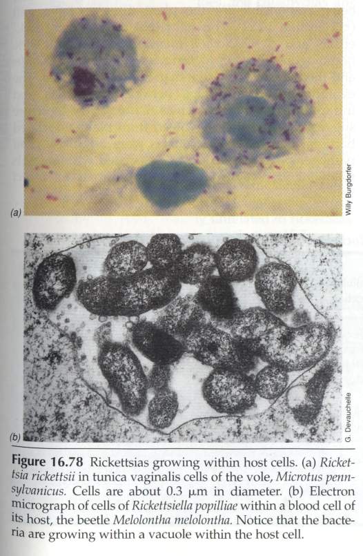 - 立克次氏体是人类斑疹伤寒、恙虫热和Q热等严重传染病的病原体。一般寄生于虱、蚤等节肢动物消化道的上皮细胞,并在其中大量繁殖,细胞破裂后所释放的大量个体随粪便排出。当虱、蚤叮咬人体时,乘机排粪,在人体抓痒之际,粪中立克次氏体便随即从伤口进入血流,在血细胞中大量繁殖并产生内毒素,置人于死地。
